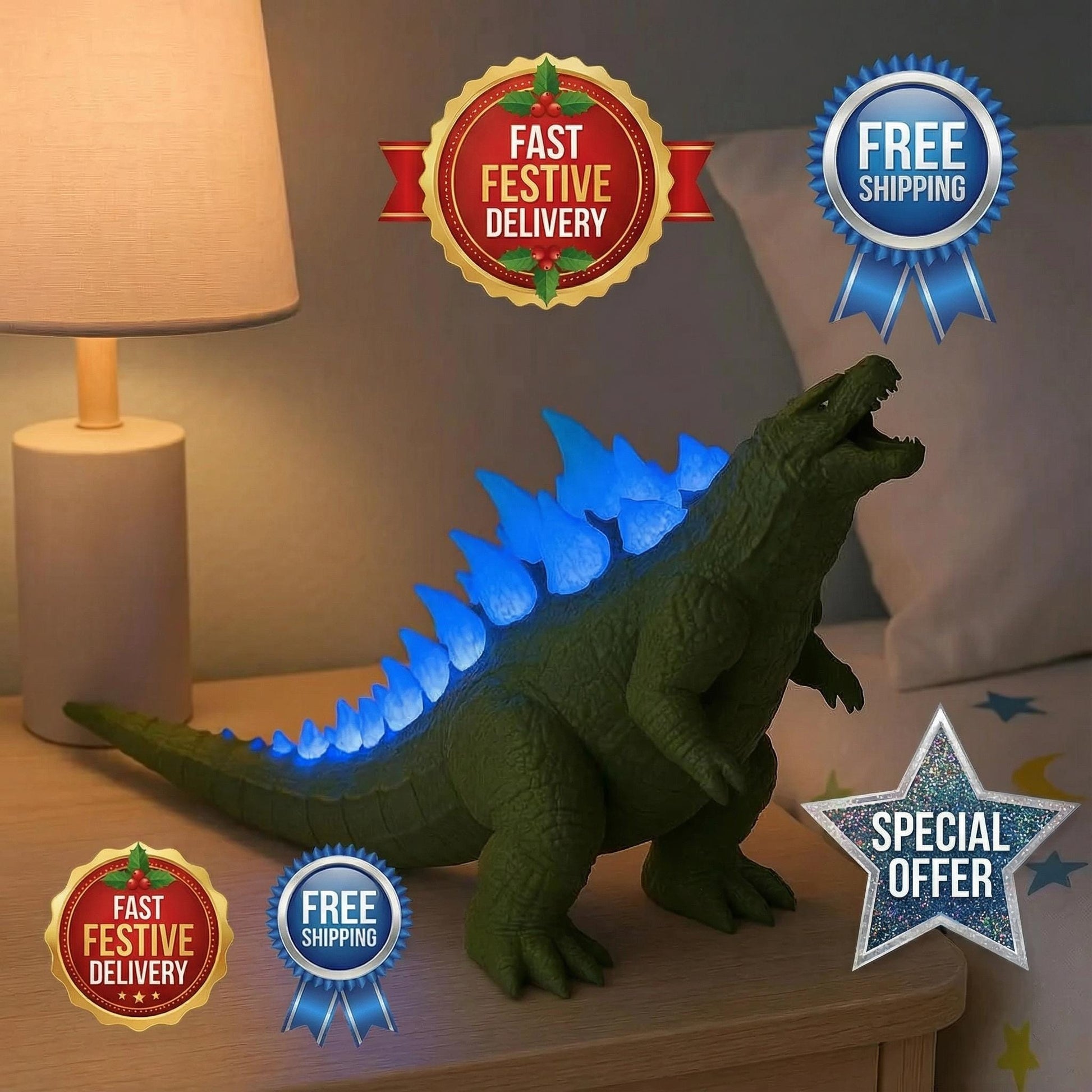 This handmade lamp features Godzilla’s iconic dorsal plates that glow blue or green when lit, powered by discreet built-in LEDs.